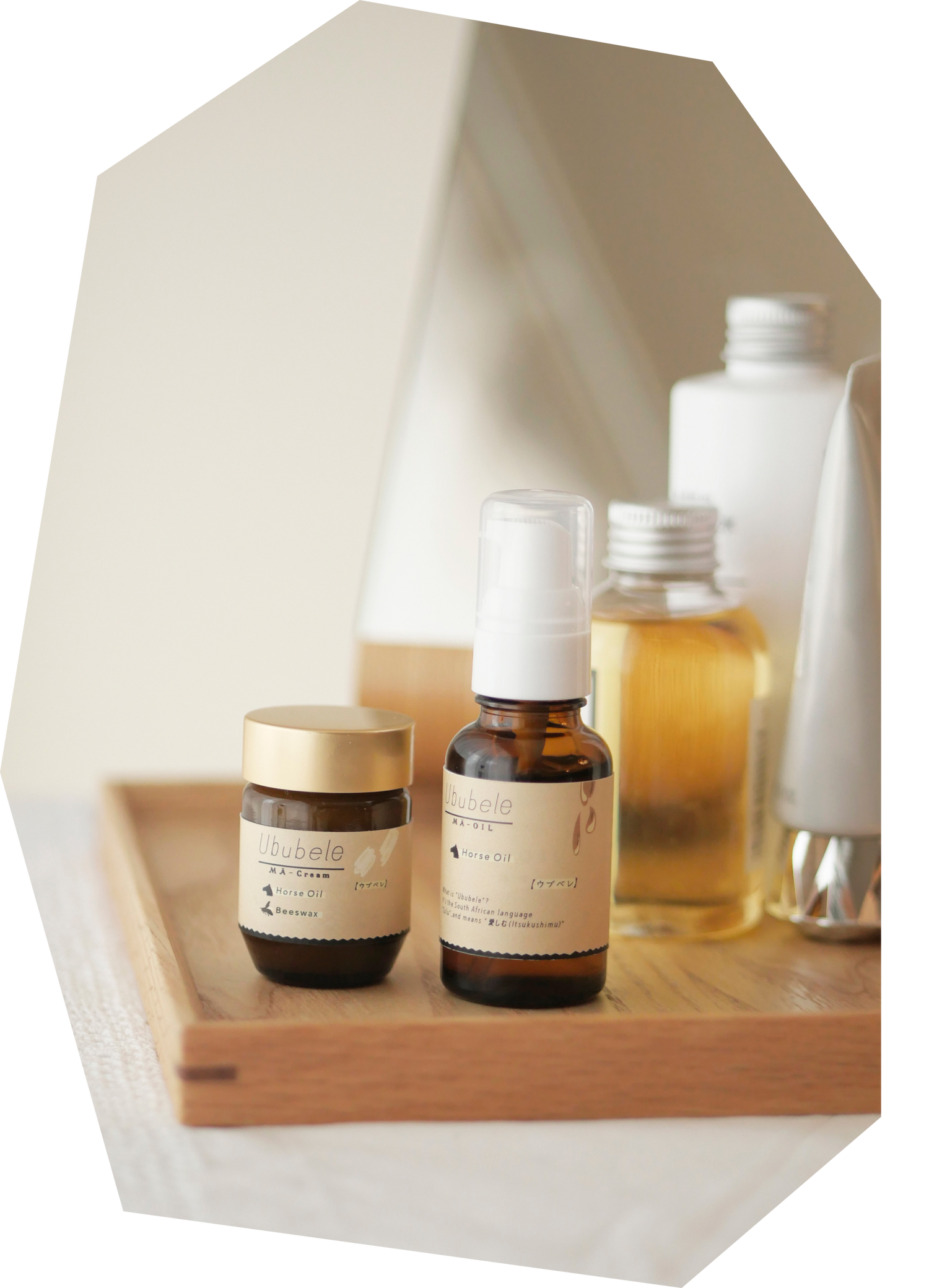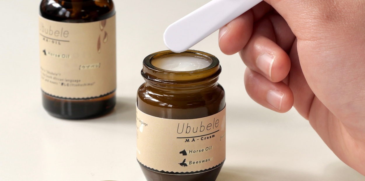 馬油は原料に馬の脂を使いますが、その原料となる馬によっても、馬脂の新鮮さや質の高さが変わってきます。Ububeleシリーズに使用される原料(馬脂)は、全国的に馬刺しなどで有名な、熊本県で育った食用の馬の脂を使用し、育て方やエサにこだわりのある牧場と契約。馬刺しと同じタイミングで馬脂を取り分け、急速冷凍で保管することで品質の劣化を防ぎ、管理の仕方にもこだわりを持っています。人の皮脂組成にとても近い馬油は保湿力も高く、人の肌との親和性の高さも自慢です。