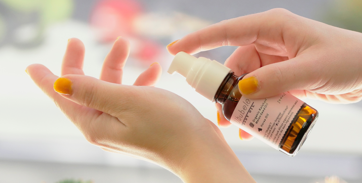 化粧水の前に、ブースターとして「ウブベレ マーオイル」を1〜2プッシュ手に取り、顔全体に馴染ませます。